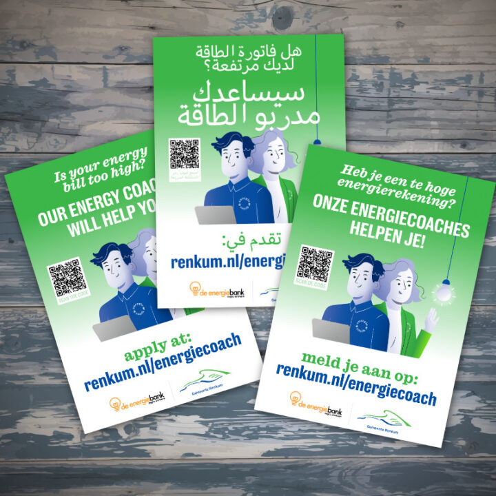 Om de energiewinkel in de hele gemeente bekendheid te geven, ontwierpen we in een vergelijkbare stijl als de andere uitingen straataffiches. De kleine campagne had een opbouw van drie fasen: